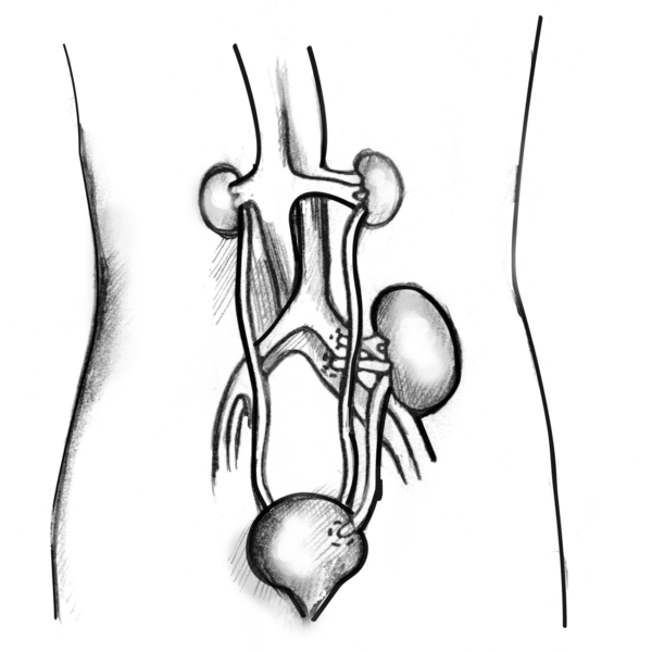 Anatomical diagram of a female figure with a transplanted kidney. The two diseased kidneys are still in place on either side of the spine, just below the rib cage. The Picture of a transplanted kidney inside an outline of the abdomen. The two damaged kidneys are still in place on either side of the spine, just below the rib cage. The transplanted kidney is located on the left side, just above the bladder. A transplanted ureter connects the new kidney to the bladder. Labels point to the damaged kidneys, transplanted kidney, bladder, and transplanted ureter.