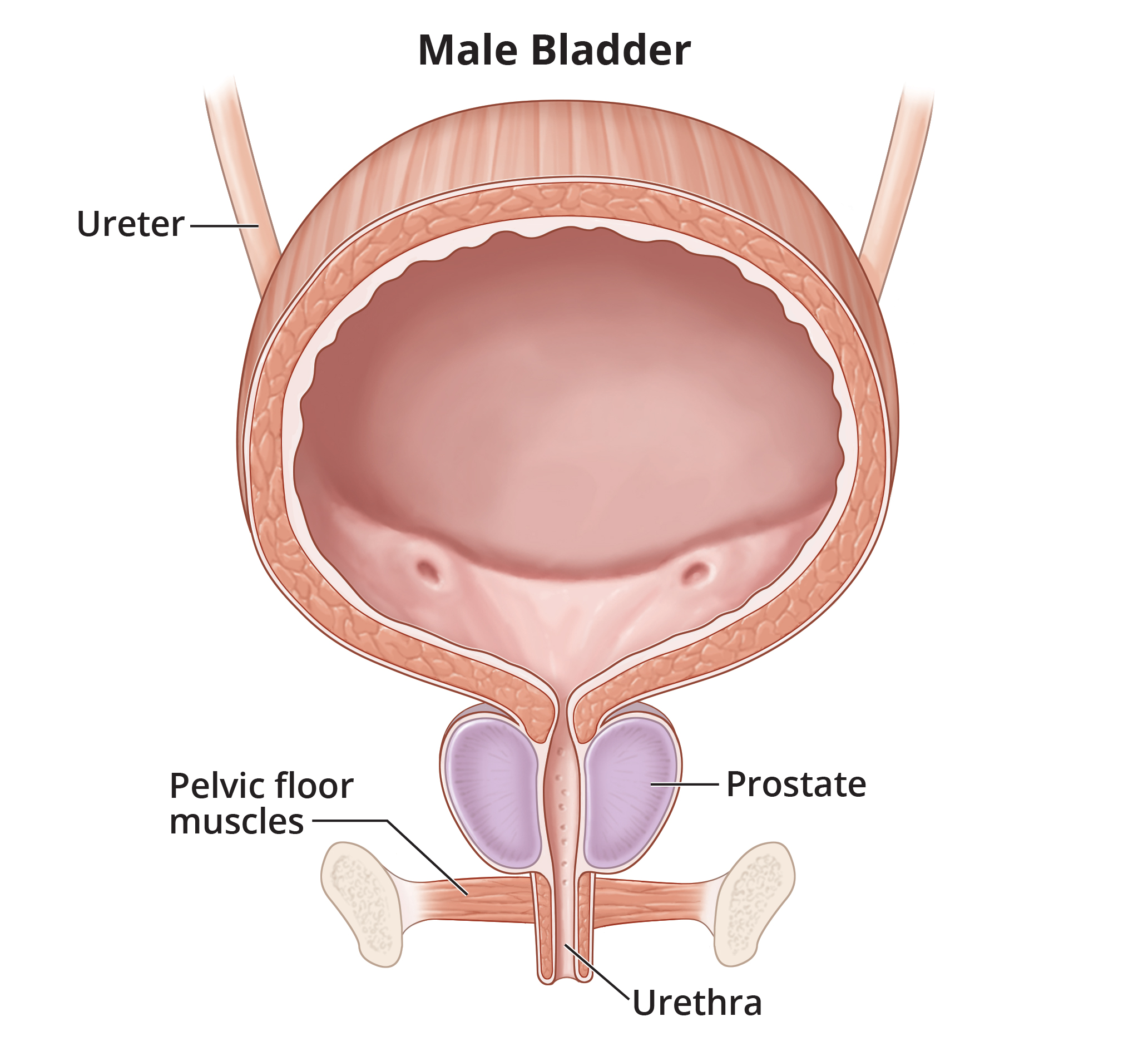 Illustration of the male bladder including the ureters, urethra, prostate, and pelvic floor muscles. The ureter, pelvic floor muscles, prostate, and urethra are labeled.