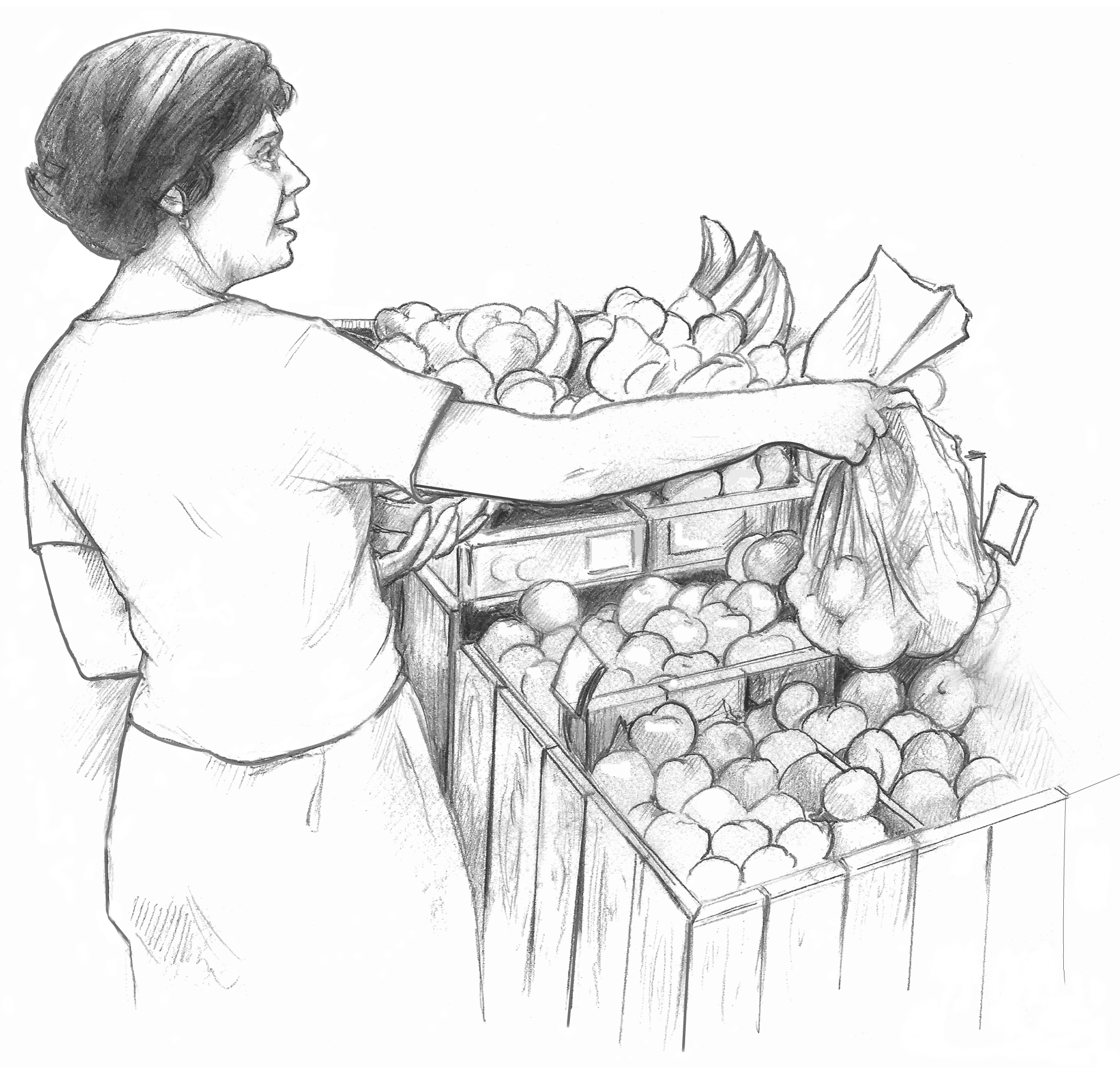 Drawing of a female bagging produce at the supermarket.