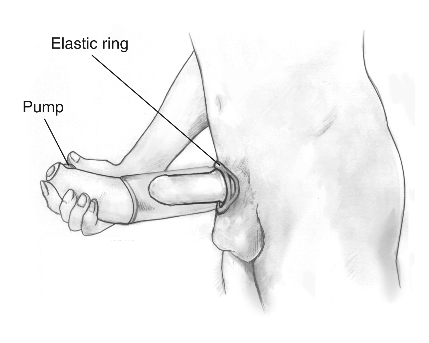 Drawing of a man’s lower torso and a vacuum device over his penis. Labels point to the pump and an elastic ring around the base of the penis.