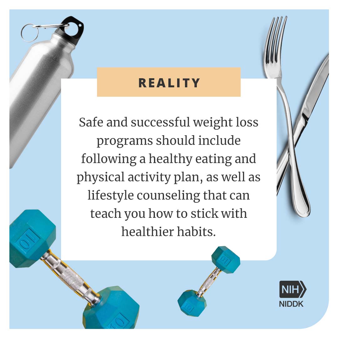 Reality: Safe and successful weight-loss programs include healthy eating, physical activity plans, and lifestyle counseling.