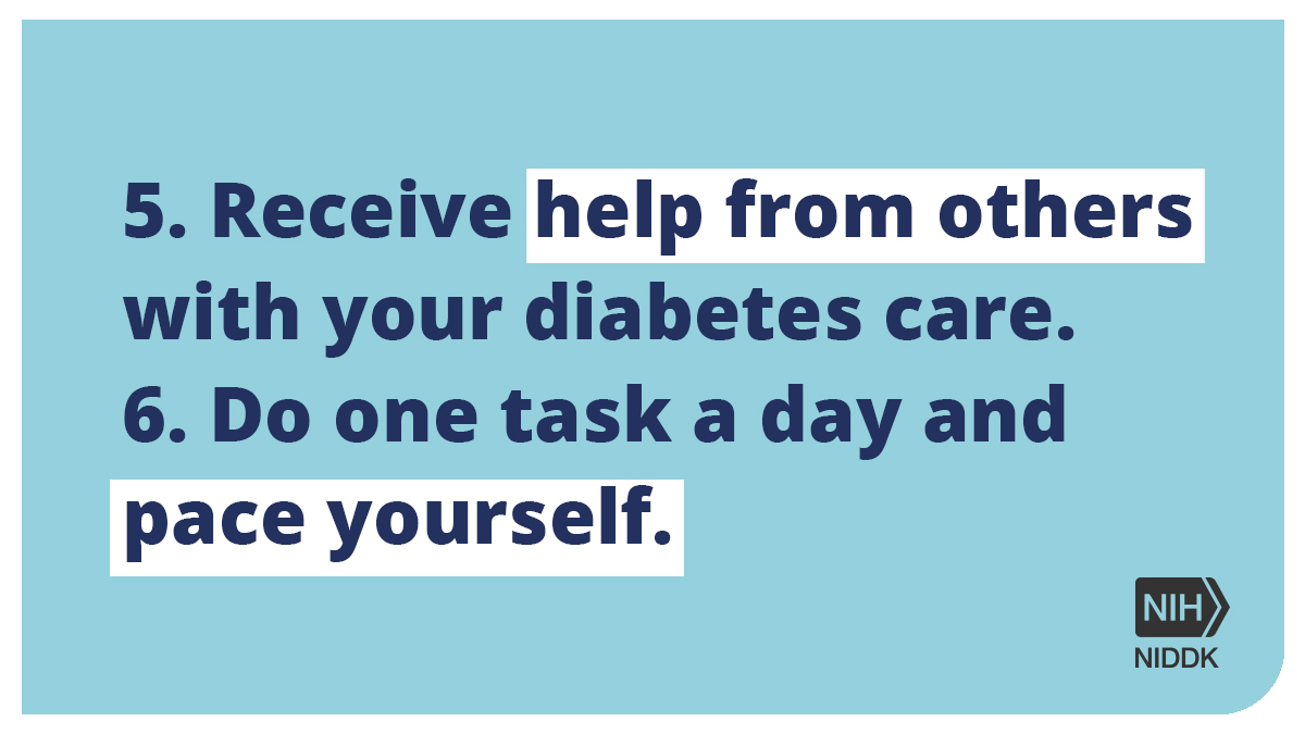 5. Receive help from others with your diabetes care. 6. Do one task a day and pace yourself.